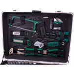 Met een breed scala aan gereedschap, zoals combinatiekabelschoenen, waterpomptang, hobbymes met reservemessen, beugelzaag met reservebladen, precisie- en werkplaatsschroevendraaiers, verstelbare moersleutel en nog veel meer, bent u voorbereid op elke klus die op uw pad komt.