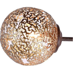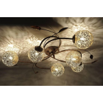 Laat je betoveren door de plafondlamp Greta, een prachtig kunstwerk dat uitstaalt als een sierlijk bloemstuk aan je plafond. Het frame van deze lamp is gemaakt van roestkleurig staal en is decoratief gedraaid. De zes lampenkappen zijn vervaardigd uit goudkleurig geschilderde metalen bollen met gaten, wat zorgt voor een fascinerend licht- en schaduwspel aan het plafond.