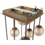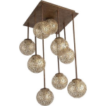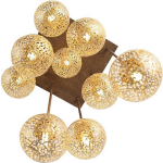 Greta is een plafondlamp die echt in het oog springt. Met negen bolvormige kappen van geperforeerd metaal en een mooi patroon, in combinatie met een goudkleurige afwerking, zorgt deze lamp voor een prachtige interieurstijl. De kappen zijn gelijkmatig verdeeld aan vaste armen, op verschillende hoogtes aan het vierkante baldakijn opgehangen. De lampenarmen, evenals het roestkleurige baldakijn, creëren een mooi contrast met de kappen, waardoor deze nog mooier tot hun recht komen. De plafondlamp Greta heeft ook een bijzondere lichtwerking, doordat de kappen alleen licht doorlaten via de perforaties. Je kunt deze lamp gemakkelijk dimmen met behulp van een externe dimmer, zoals een wand draaidimmer. Houd er echter rekening mee dat de dimmer en de lampen niet zijn inbegrepen in de levering.