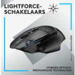 De G502 X LIGHTSPEED is de vernieuwde versie van de wereldwijd populaire G502 Gaming Mouse. Met hybride optisch-mechanische schakelaars en verbeterde draadloze LIGHTSPEED-technologie biedt deze muis ongekende snelheid, betrouwbaarheid en precisie. De HERO 25K-submicronsensor zorgt voor nauwkeurige scans, terwijl de aanpasbare en verwijderbare dpi-verschuifknop en het scrollwiel met twee standen zorgen voor intuïtieve bediening. Met een dunne behuizing en lichtgewicht constructie is deze muis een waar lichtgewicht. Met een batterijlevensduur geoptimaliseerd tot 140 uur gamen, hoef je nooit meer zonder muis te zitten. De voetjes van PTFE zorgen voor minimale wrijving en soepele bewegingen.