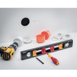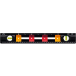 Deze waterpas heeft 2 niveau libellen en is niet-magnetisch. De libel heeft een hoek van 180° en 90°. Het wordt geleverd met libellen en heeft geen handgreep. De waterpas is zwart van kleur, met extra kleuren rood en geel. De afmetingen zijn 2 cm diep, 13 cm hoog en 40 cm breed. Het gewicht is 330 g.