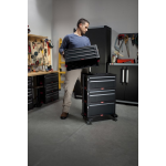 Dankzij de ingebouwde zwenkwielen is het verplaatsen van het gereedschapssysteem een eitje. U kunt het systeem eenvoudig verplaatsen naar elke gewenste locatie in uw werkruimte. Daarnaast zijn de handgrepen ontworpen voor een comfortabele grip.