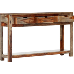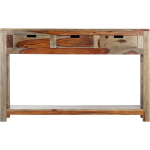 Gemaakt van massief sheeshamhout, massief acaciahout en bewerkt hout, heeft deze wandtafel de afmetingen van 120 x 30 x 75 cm (B x D x H). Het meubelstuk is gepolijst, geverfd en gelakt om een duurzame en luxe afwerking te garanderen. Met 3 lades en 1 onderschap biedt deze console tafel voldoende opbergruimte zonder afbreuk te doen aan de stijlvolle uitstraling.
