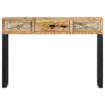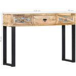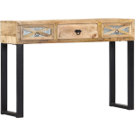 Elke stap in het productieproces van onze wandtafel wordt met de grootste zorg uitgevoerd. Of het nu gaat om polijsten, verven of lakken, we garanderen dat elk detail perfect is afgewerkt. Het massieve mangohout is dicht en robuust, met prachtige bruine of gouden strepen en contouren die het oppervlak sieren. De tafel is voorzien van twee lades, waardoor je al je spulletjes geordend en binnen handbereik kunt houden.
