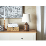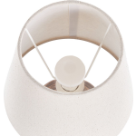 Deze lamp heeft een traditioneel ontwerp dat perfect past in elke interieurstijl. De trommelvormige lampenkap en de mat afgewerkte keramische basis geven de lamp een tijdloze uitstraling. De lamp is klein genoeg om zelfs op een smal oppervlak te passen, maar heeft nog steeds voldoende aanwezigheid om een statement te maken in je kamer.
