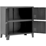 Deze opbergkast is voorzien van vier deuren, elk met een labelhouder en ventilatieopeningen. Dit benadrukt niet alleen de industriële stijl, maar maakt het ook gemakkelijk om je spullen netjes op te bergen. Het bijgeleverde schap zorgt voor extra opbergruimte en maakt het mogelijk om je documenten in verschillende categorieën te organiseren.