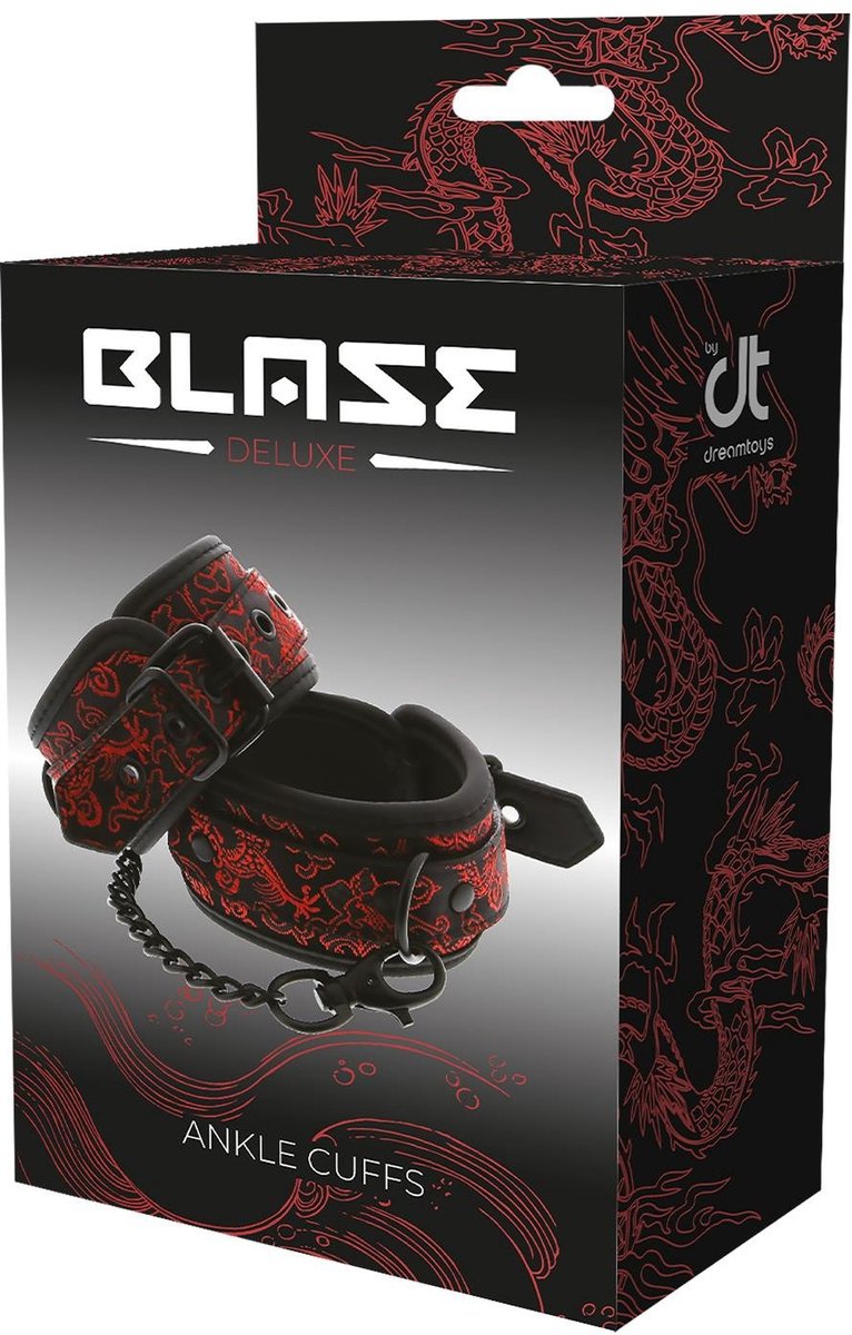 Merk: Blaze . Prachtig afgewerkte luxe enkelboeien in het zwart met een rood burlesque patroon. Enkelboeien zijn ideaal om meer controle op je partner uit te oefenen. Het spel van overgave kan beginnen!