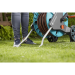 De Gardena AquaRoll M Easy is een slangenwagen die uitgerust is met innovatieve kenmerken om uw bewateringsklusjes in de tuin te vergemakkelijken. Met het speciaal gevormde onderstel geniet u van uitstekende stabiliteit, waardoor de slangenwagen stevig op zijn plaats blijft, zelfs wanneer er aan de slang wordt getrokken. Daarnaast zorgt de slanggeleider ervoor dat uw slang gelijkmatig wordt opgerold, zonder dat u handmatig hoeft bij te sturen. Met slechts een draai aan de zwengel wordt uw tuinslang moeiteloos opgerold.