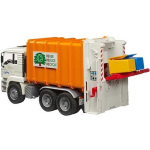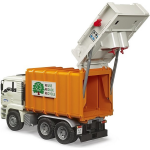 De Bruder MAN TGA vuilniswagen is het perfecte speelgoed om de straten schoon te houden. Met de meegeleverde containers kun je eenvoudig afval verzamelen. Vervolgens kun je met de vuilniswagen langsrijden om het afval op te halen. Het laden van de vuilnisbakken is heel gemakkelijk, je hangt de container achter de vrachtwagen en kiept deze eenvoudig in de laadbak met behulp van een knopje. Als de laadbak vol is, kun je naar de vuilstort rijden om de lading te lossen. Dit kun je doen door de laadbak te kiepen, waardoor al het afval eruit glijdt. Neem een Bruder figuurtje mee in de cabine en open de portieren voor een realistische speelervaring.