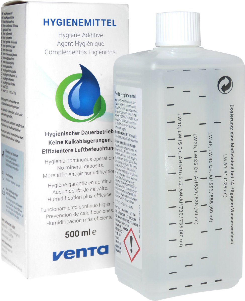 Met het Venta Hygiënemiddel 500 ml zorg je ervoor dat je Venta luchtbehandelingsapparaten optimaal blijven werken. Dit middel beschermt het apparaat tegen schadelijke stoffen en bacteriën, waardoor je kunt genieten van schone en gezonde lucht. Het water in de luchtbehandelingsapparaten kan door kalkafzetting korstjes vormen, maar dankzij het Venta Hygiënemiddel wordt de hardheid van het water aangepast, zodat deze korstjes worden voorkomen. Bovendien ondersteunt het middel het verdampingsproces door parelvorming van het water op het kunststof te voorkomen, waardoor de stapel lamellen volledig bevochtigd wordt.