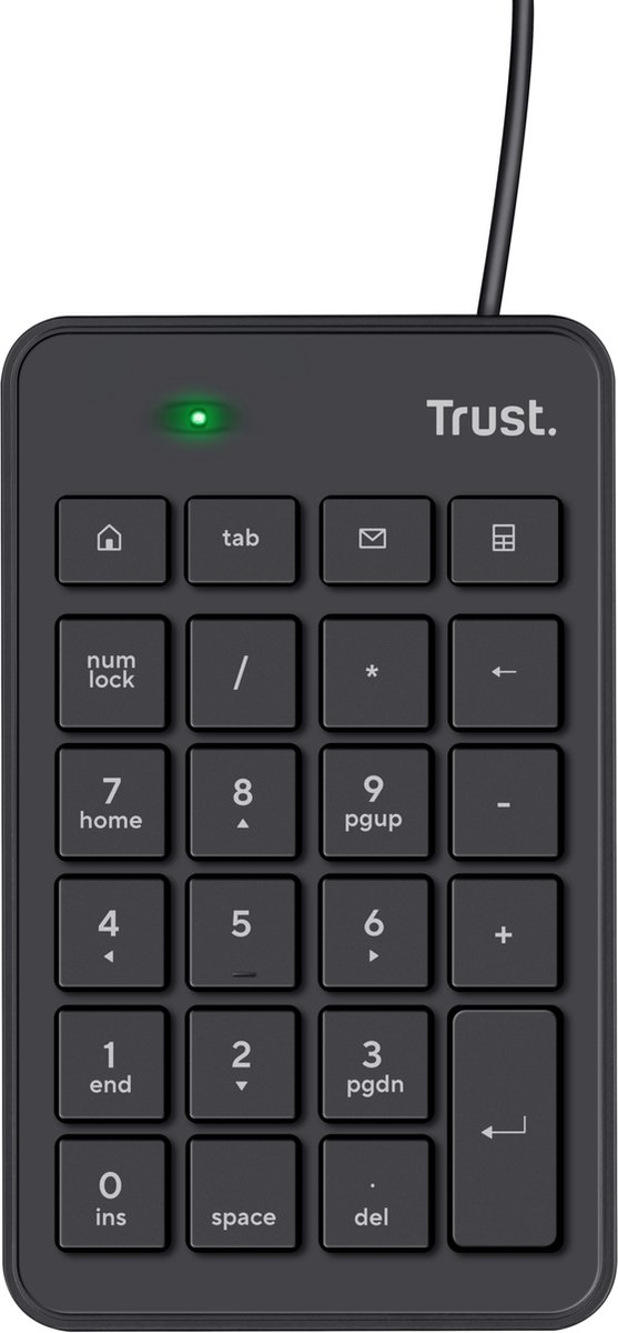 Met het Trust Numeriek Toetsenbord kun je moeiteloos cijfers invoeren op je Windows laptop. Naast de standaard cijfers beschikt dit toetsenbord ook over 5 extra handige toetsen: startpagina, tab, e-mail, spatie en rekenmachine. Dankzij het schuine ontwerp en de 23 toetsen op volledige grootte, is comfortabel en nauwkeurig typen gegarandeerd. Of je nu rechts- of linkshandig bent, dit toetsenbord is geschikt voor iedereen.