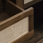 De Boas vitrinekast van Olivine is een prachtige houten kast met een retro Scandinavische stijl. Het vintage ontwerp, gemaakt van hout en afgewerkt met een laag eiken fineer in de kleur gerookt eiken of naturel hout, voegt direct warmte en karakter toe aan jouw interieur. De massief eikenhouten poten en het rattan detail in de twee lades geven deze vitrinekast een uniek en stijlvol tintje.