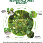 De buxusmot is actief van half april tot en met oktober, met een piek tussen midden juli en eind september. In deze periode kunnen er maar liefst drie generaties buxusmotten ontwikkelen. Door de mannetjesmotten te vangen met behulp van de buxusmotval, wordt de levenscyclus van de motten onderbroken. Dit helpt om de populatie onder controle te houden en verdere schade aan de buxus te voorkomen.