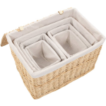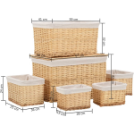 De set bestaat uit 6 rechthoekige manden in verschillende maten, evenals een deksel voor de grootste mand, die ook kan dienen als een handige wasmand. De manden zijn geweven in een aantrekkelijke stijl die een rustieke charme toevoegt aan je interieur. Of je nu een landelijk, klassiek of modern interieur hebt, deze set past perfect.