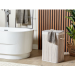 De binnenkant van de mand is opgevuld met uitneembare en wasbare stof, waardoor hygiënisch gebruik gegarandeerd is. Het deksel en de zijkanten van de mand zijn voorzien van extra handvatten, waardoor het transport moeiteloos verloopt. Dankzij het ruime ontwerp biedt deze mand voldoende opbergruimte voor zowel wasgoed als accessoires.