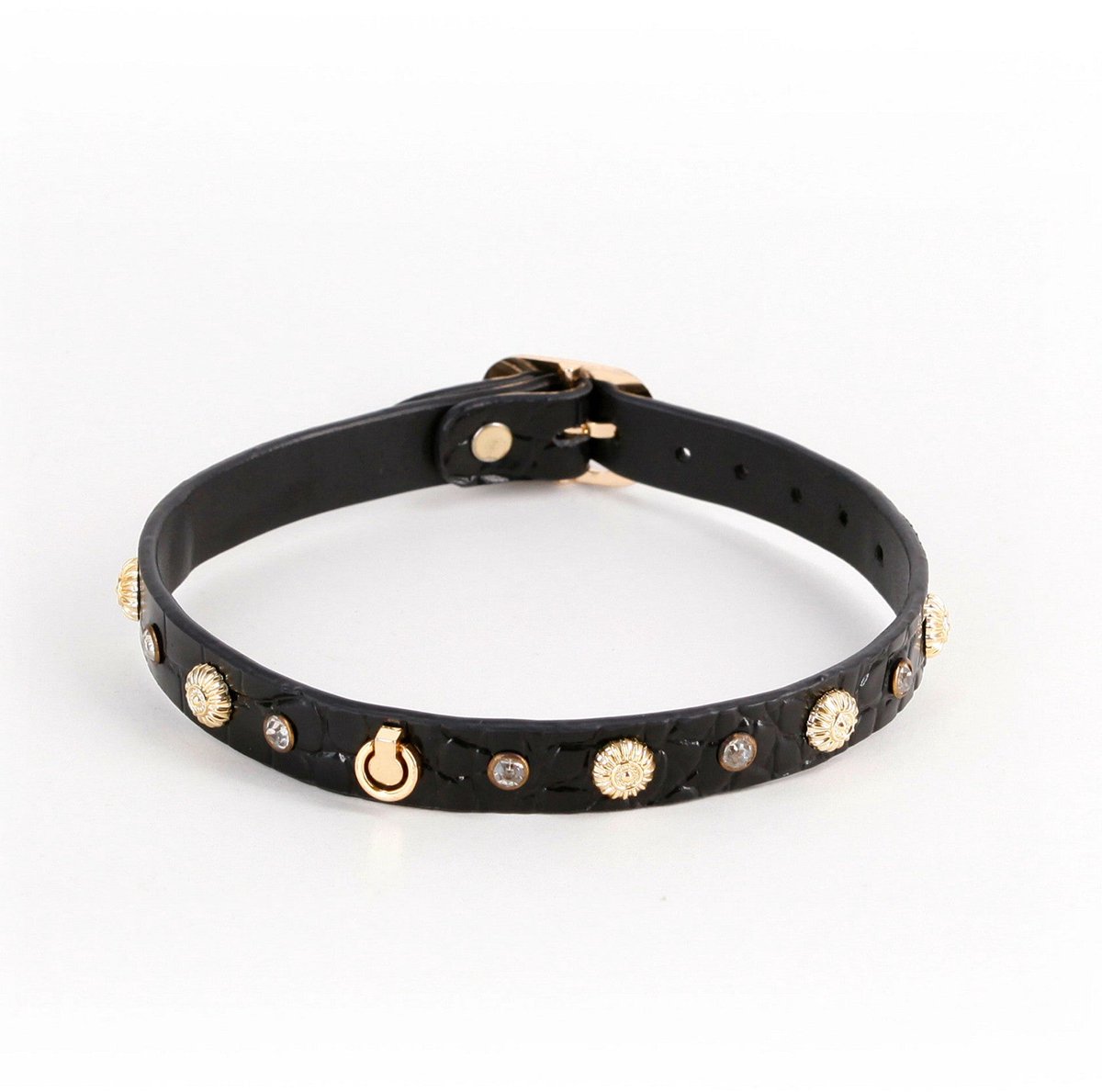 De Alina Collar van NS Novelties is een verfijnde accessoire ontworpen voor wie houdt van elegantie en stijl in hun intieme momenten. Deze halsketting combineert fashion met functionaliteit, perfect voor submissieve partners die een statement willen maken. Kenmerk van de Alina Collar zijn de schitterende kristallen en gouden zonnecharmes die een luxe uitstraling geven. Het ontwerp is verstelbaar voor nekken van 29 tot 44 cm (11,5 tot 17,5 inch),waardoor het voor de meeste gebruikers comfortabel past. De verstelbare gesp zorgt voor een veilige en aangepaste pasvorm. Gemaakt van hoogwaardig vegan leer (PU) en nikkelvrij metaal hardware, is deze collar zowel duurzaam als veilig voor gevoelige huid. De O-ring aan de voorkant biedt mogelijkheden voor het bevestigen van een riem of ketting (apart verkrijgbaar),wat extra speelmogelijkheden creëert. De Alina Collar is eenvoudig schoon te maken met een mild zeepje en warm water. Zorg ervoor dat het product volledig droog is voordat je het opbergt op een koele, droge plaats. Dit stuk is perfect voor rollenspel, BDSM-verkenning of eenvoudig als een statement-accessoire. Of je nu een beginner bent of ervaren, de Alina Collar voegt een touch van elegantie en controle toe aan je intieme leven.