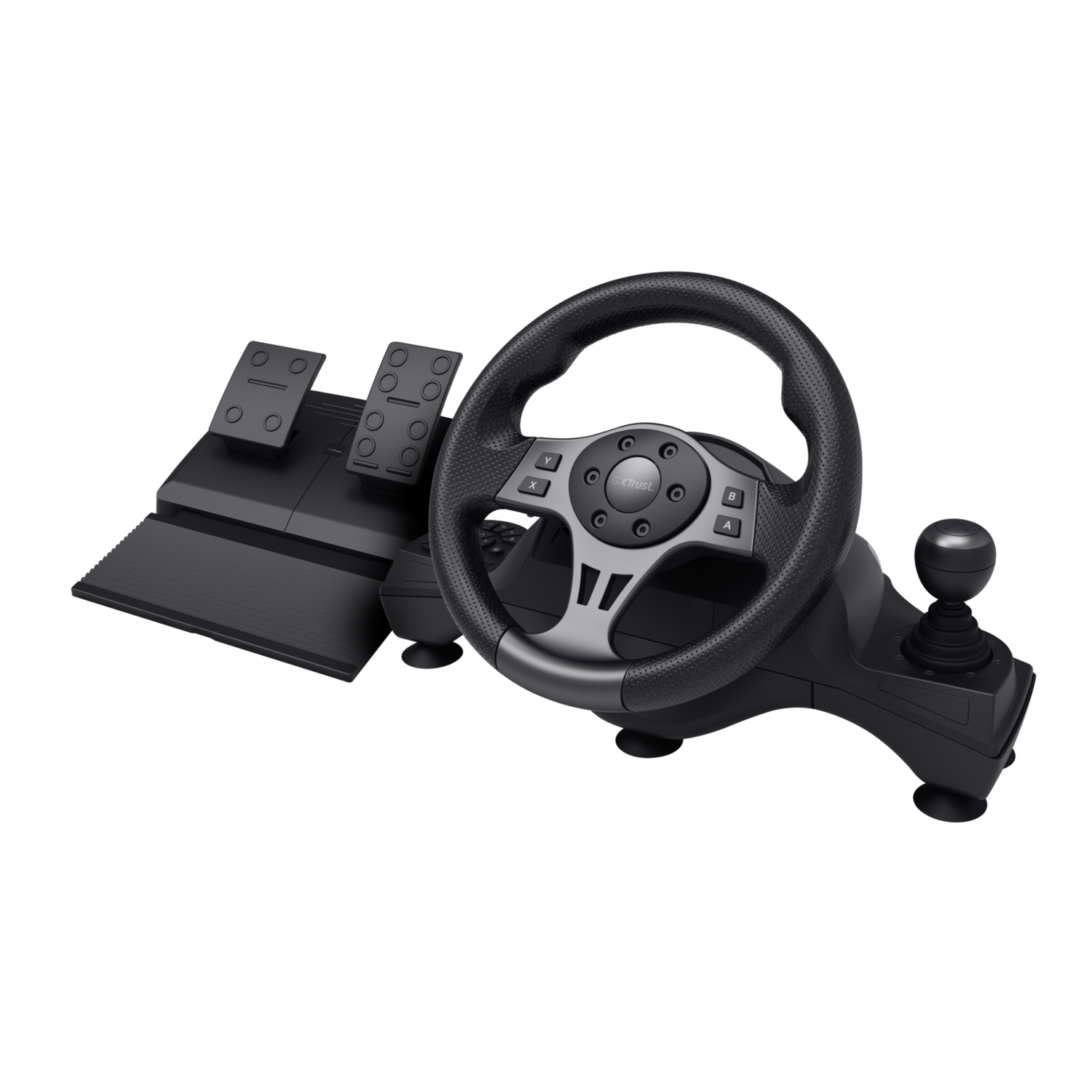 Maak gebruik van het Trust GXT 289 Movi racestuur voor een realistische race-ervaring, compleet met trillingsfeedback en pedalen. Klaar voor de race Race zoals je nog nooit deed met het Movi Racestuur. Het is geschikt voor pc- en console-gaming (Xbox Series X/S, Switch en PS4) en geeft een superrealistische race-ervaring, maar dan gewoon thuis. In de actieve versnelling Rij in stijl en snel dankzij het comfortabele stuur met rubberen textuur. De pedaalschakelaars, handpook en een achteruitversnelling geven je het gevoel dat je echt in een raceauto zit. Hangen in de bocht Met een rotatiebereik van 270° en een virtuele hoek van 900° (2,5 keer het stuur draaien),is dit stuur perfect voor alles van racegames tot vrachtauto's, boerderijen en bussimulators. Het heeft zelfs vibratiefeedback voor de meest echte race-ervaring. Solide als een pro Race alsof je nooit anders hebt gedaan. De inbegrepen klemmen van de Movi, zuignappen en antislip basis voor de pedalen houdt dit stuur goed op zijn plek, hoe intens de actie ook wordt.