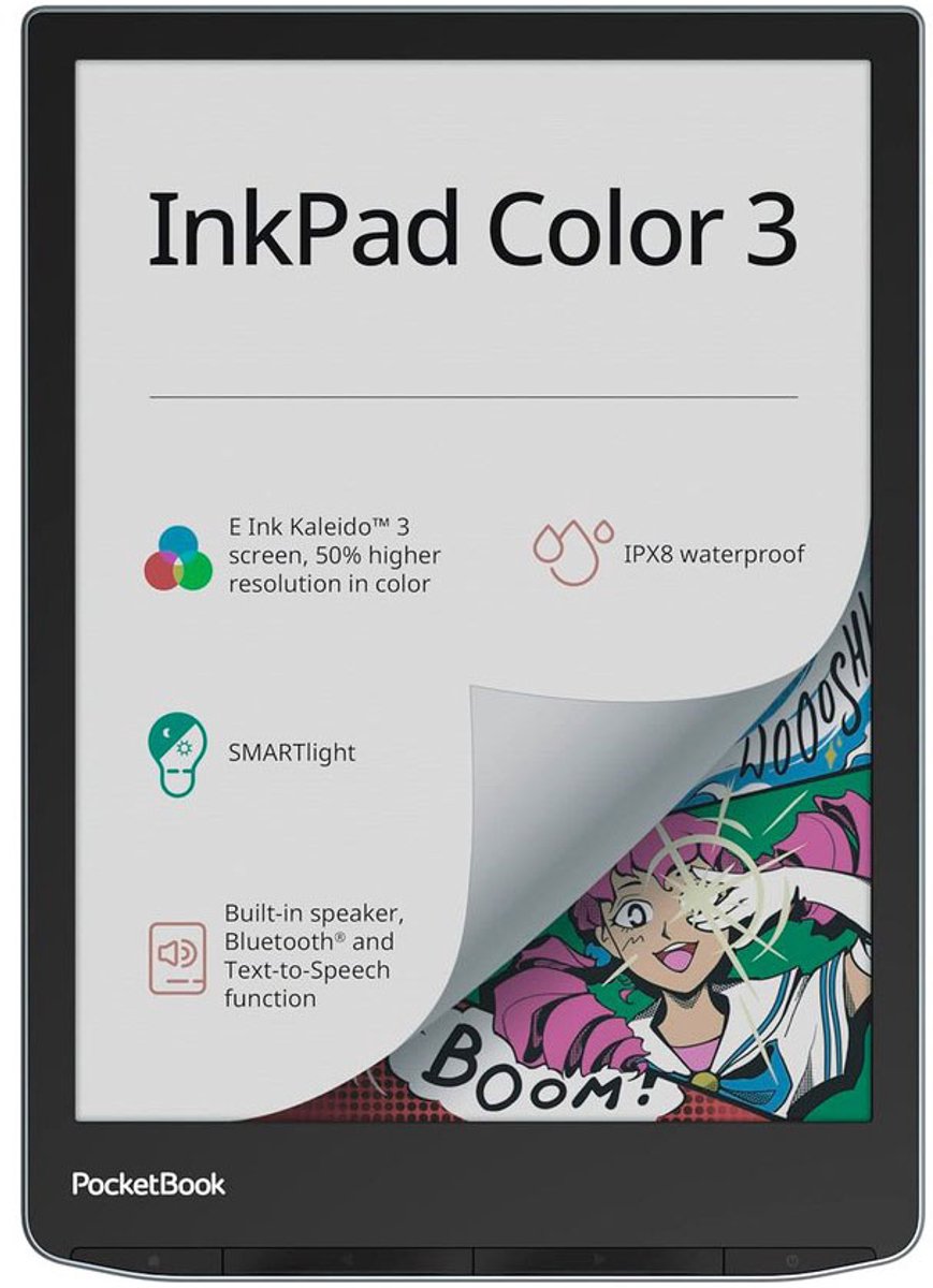 Met zijn geavanceerde 7,8-inch E-Ink Kaleido 3 kleurendisplay van de nieuwste generatie biedt de PocketBook InkPad Color 3 een scherp contrastrijk lettertype een een zeer rijke kleurweergave. Deze e-reader is uitgerust met SMARTlight, een geïntegreerde luidspreker, Bluetooth®, waterbestendigheid volgens IPX8 en een krachtige quad-coreprocessor. Deze combinatie van functies maakt de InkPad Color 3 een bijzonder complete e-reader.