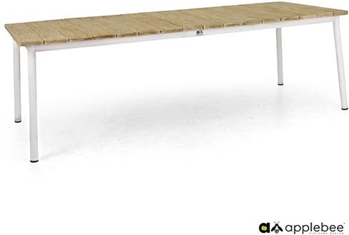 De Apple Bee Milou Tuintafel White - 180x90 cm is een typisch Apple Bee design tuinmeubel! Het ontwerp is modern en stijlvol en de gebruikte materialen van zeer hoge kwaliteit. Deze Apple Bee tuintafel heeft een onderstel van wit aluminium. Het tafelblad is gemaakt van teakhout met een white wash finish. Het teakhout is voorzien van een SLVK keurmerk. Alle gebruikte materialen zijn duurzaam, weerbestendig en onderhoudsvriendelijk.Combineer de Apple Bee Milou Tuintafel met Milou Dining Tuinstoelen en u heeft een prachtige diningset waaraan u zomers heerlijk buiten kunt tafelen!Bij gebruik van een hoes over de tafel (niet inbegrepen): Zorg ervoor dat er geen plasvorming kan ontstaan op de hoes. Plaats een vorstbestendige bloempot omgekeerd in het middel van het tafelblad, onder de hoes, zodat regenwater van de hoes af glijdt en er altijd ventilatie is onder de hoes. Anders kan het overmatige vocht de tafel beschadigen.ProductvoordelenDuurzaamWeerbestendigOnderhoudsvriendelijk
