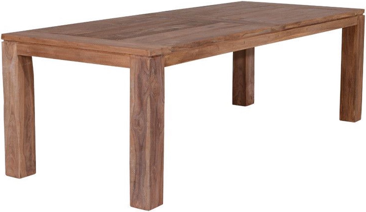 Bent u op zoek naar een stoere en robuuste tuintafel? De teak houten Mexico tafel is dan zeker een goede keuze! Combineer deze fraaie dining tafel met moderne tuinstoelen voor een hippe tuinset.Deze rechthoekige tafel is volledig vervaardigd uit teak hout. Teak is sterk, robuust en heeft weinig onderhoud nodig. Elk stuk zorgvuldig geselecteerd teak is uniek en geeft de tafel zijn eigen karakter. Teakhout is van nature vettig en zal na verloop van tijd vergrijzen. Voor het maken van deze tafel is uitsluitend legaal gekapt en gerecycled teakhout gebruikt. De Mexico tuintafel is dus ook een heel verantwoorde keuze.Bij gebruik van een hoes over de tafel (niet inbegrepen): Zorg ervoor dat er geen plasvorming kan ontstaan op de hoes. Plaats een vorstbestendige bloempot omgekeerd in het middel van het tafelblad, onder de hoes, zodat regenwater van de hoes af glijdt en er altijd ventilatie is onder de hoes. Anders kan het overmatige vocht de tafel beschadigen.ProductvoordelenDuurzaamWeerbestendigOnderhoudsvriendelijk