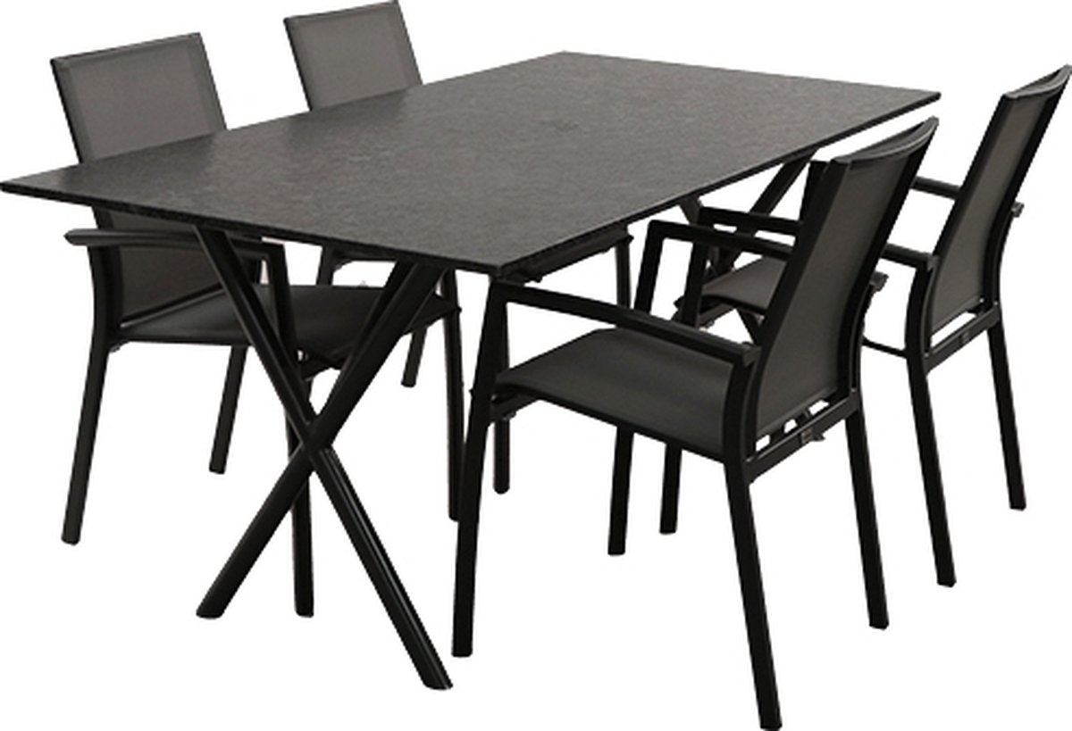 Deze luxe Diningset Sutherland - Colmar van Buitengewoon Boet is geschikt voor 4 personen.De tafel heeft een strakke, stoere look. Het materiaal van het onderstel bestaat uit zwart gepoedercoat staal, wat is toegepast in robuuste afmetingen. Het tafelblad is gemaakt van graniet.De tuinstoelen hebben een frame gemaakt van lichtgewicht aluminium. De stoelen hebben een comfortabele textileen zitting. Het grote voordeel van textileen is dat het zich helemaal naar je lichaam vormt en je super comfortabel zit. Je hebt dus helemaal geen kussen meer nodig! Bij gebruik van een hoes over de tafel (niet inbegrepen): Zorg ervoor dat er geen plasvorming kan ontstaan op de hoes. Plaats een vorstbestendige bloempot omgekeerd in het middel van het tafelblad, onder de hoes, zodat regenwater van de hoes af glijdt en er altijd ventilatie is onder de hoes. Anders kan het overmatige vocht de tafel beschadigen.Product voordelen:DuurzaamHoogwaardige, luxe materialenOnderhoudsvriendelijkAfmetingen (cm)Tafel: L180 x B90 x H75Tuinstoel: L56 x B56 x H89
