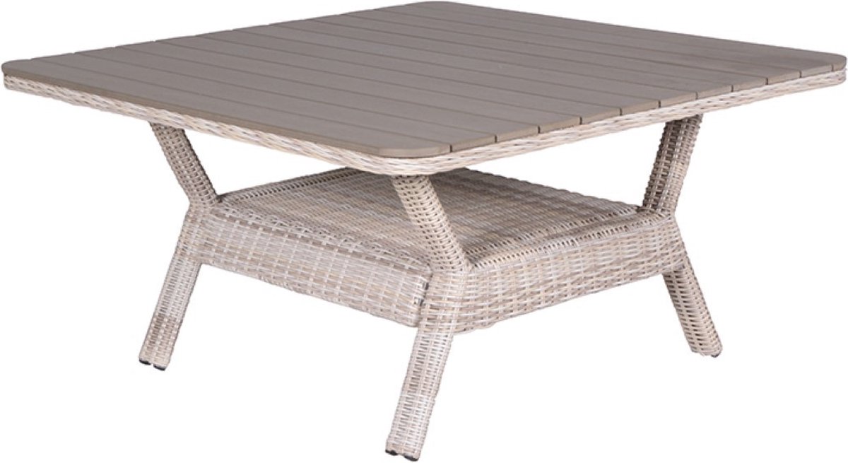 Vierkante eettafel voor buiten! De veelzijdige tuintafel heeft een lichte kleur en is met zijn hoogte van 70 cm uitstekend geschikt als eettafel. Het tafelblad is gemaakt van het duurzame en onderhoudsvriendelijke polywood. Het aluminium frame is voorzien van halfrond breed wicker vlechtwerk. Deze tuintafel kunt combineren met de tuinstoelen uit dezelfde collectie.Bij gebruik van een hoes over de tafel (niet inbegrepen): Zorg ervoor dat er geen plasvorming kan ontstaan op de hoes. Plaats een vorstbestendige bloempot omgekeerd in het middel van het tafelblad, onder de hoes, zodat regenwater van de hoes af glijdt en er altijd ventilatie is onder de hoes. Anders kan het overmatige vocht de tafel beschadigen.Product voordelen:DuurzaamOnderhoudsvriendelijk100% WeersbestendigUv-bestendigAfmetingen (cm)L140 x B140 x H70