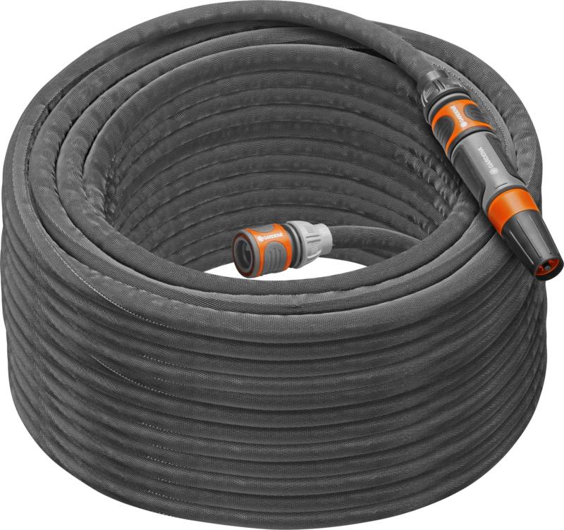 De gebruiksklare Textielslang Liano Life 30 m Set van GARDENA is ideaal voor korte en middellange bewatering. De 30 m lange Liano Life is perfect voor je grote tuin. De set bevat de veelzijdige textielslang met een diameter van 13 mm (1/2"),de voorgemonteerde Original GARDENA System-onderdelen: Liano Slangstukken, maar ook de Liano Waterstop, een Reinigingspistool en twee Kraanstukken. Het reduceerstuk in een van de kraanstukken laat je hem op in totaal drie kraanmaten aansluiten. De Liano Life bestaat uit een flexibele PVC-binnenslang en een innovatieve buitenslang, gemaakt van bestendig textiel. Dit zorgt voor zijn betrouwbare prestaties. Bij het bewateren van de tuin of schoonmaken rond het huis, is de flexibele Liano Life indrukwekkend comfortabel in gebruik. Dankzij zijn aangename textuur ligt hij comfortabel in de hand. Hij knikt niet bij het bewegen en kan makkelijk om obstakels worden geleid. Het lage gewicht van de textielslang is bijzonder handig bij langdurig gebruik: hij is tot wel 50% lichter dan conventionele PVC-slangen. Dankzij zijn elasticiteit kan de Liano Life op een ruimtebesparende manier worden opgeborgen. Of je hem nu op de plank of in de garage legt: de textielslang past zich aan aan de beschikbare opbergruimte. De barstdruk van de Liano Life is 22 bar. Hij kan zelfs buiten blijven liggen, dankzij zijn uv- en vorstbestendigheid. De slang is bovendien vrij van schadelijke stoffen zoals ftalaten (