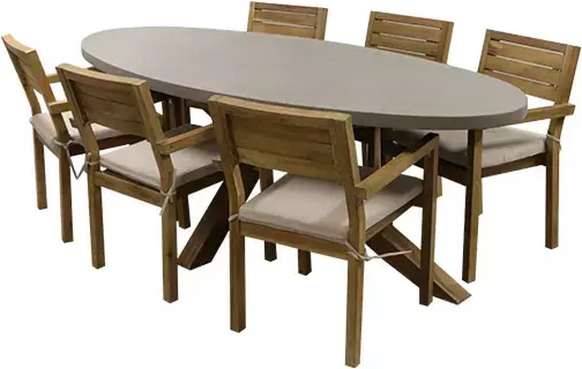 De Buitengewoon Boet Terschelling Diningset is geschikt voor 6 personen. De tuinset bestaat uit een ovalen tuintafel en 6 tuinstoelen.De tuinstoelen zijn gemaakt van acacia hout en worden geleverd inclusief comfortabele zitkussens. De tafel heeft een onderstel van acacia hout en een tafelblad van polystone.Bij gebruik van een hoes over de tafel (niet inbegrepen): zorg ervoor dat er geen plasvorming kan ontstaan op de hoes. Pla... lees meer over dit product