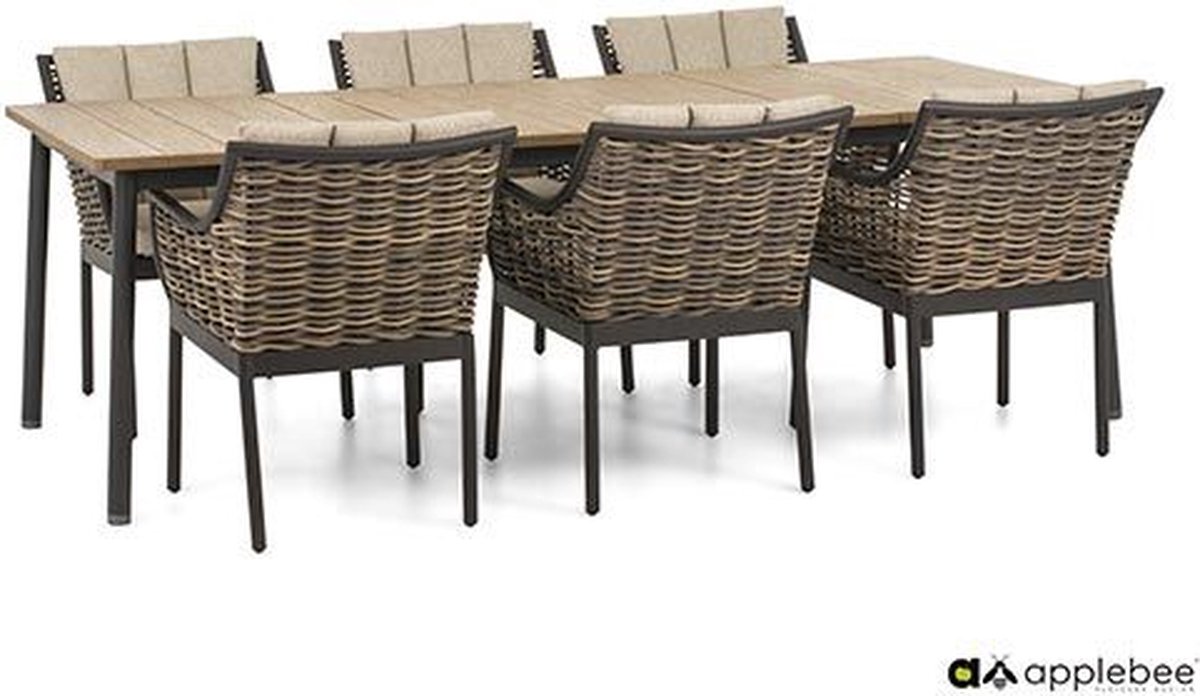 De Apple Bee Milou Diningset - Willow is een typisch Apple Bee design tuinmeubelset! Het ontwerp is modern, chique en spannend en de gebruikte materialen van zeer hoge kwaliteit. Deze Apple Bee tuinstoel heeft een opvallend zichtbaar frame van zwart aluminium. De zitting is gemaakt van vlechtdraad met een natuurgetrouwe wilgen uitstraling maar mét stevige Biculair® buitenkwaliteit. De Milou Tuintafel heeft een zwart aluminium onderstel en het tafelblad is gemaakt van teakhout met een antique finish. Het teakhout is voorzien van het SLVK keurmerk. Alle gebruikte materialen zijn duurzaam, weerbestendig en onderhoudsvriendelijk.De Apple Bee Milou DiningTuinstoel wordt geleverd met comfortabele BEE WETT® kussens. Deze speciale weerbestendige kussens kunnen gewoon buiten blijven liggen. De kussens zijn waterafstotend,Uv-bestendig, rot- en schimmelwerend en snel droog. De hoezen zijn afritsbaar en kunnen gewassen worden. Bij gebruik van een hoes over de tafel (niet inbegrepen): Zorg ervoor dat er geen plasvorming kan ontstaan op de hoes. Plaats een vorstbestendige bloempot omgekeerd in het middel van het tafelblad, onder de hoes, zodat regenwater van de hoes af glijdt en er altijd ventilatie is onder de hoes. Anders kan het overmatige vocht de tafel beschadigen.ProductvoordelenDuurzaamWeerbestendigSLVK keurmerk OnderhoudsvriendelijkAfritsbare all weather kussens Afmetingen (cm)Tuinstoel: L62 x B64 x H83Armleuning: H67Kussen: D6 Ziting: H42Tuintafel: L240 x B100 x H76