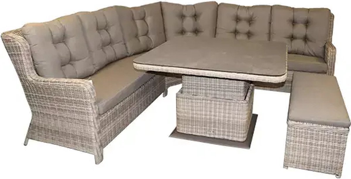 Deze zomer kun je heerlijk genieten van de zon in je eigen wicker lounge- diningset van Buitengewoon Boet! De Fenna lounge- diningset bestaat uit een grote hoek loungebank, een verstelbare tuintafel en een duo hocker. De complete set biedt plaats aan maar liefst 8 personen. De set is geschikt om heerlijk in te loungen maar je kunt er ook prima aan eten. Zo hoef je geen moment te missen van de zon!Door middel van een pendaal aan de onderkant van de tafel is de hoogte verstelbaar zodat je de tafel als salontafel en dining tuintafel kunt gebruiken.De meubelen van de Fenna loungeset hebben een aluminium basis en zijn afgewerkt met kunststof wicker vlechtwerk. De vierkante tuintafel heeft een tafelblad van polystone, afgewerkt met een kunststof coating. Alle gebruikte materialen zijn duurzaam, weerbestendig en onderhoudsvriendelijk.Bij gebruik van een hoes over de tafel (niet inbegrepen): Zorg ervoor dat er geen plasvorming kan ontstaan op de hoes. Plaats een vorstbestendige bloempot omgekeerd in het middel van het tafelblad, onder de hoes, zodat regenwater van de hoes af glijdt en er altijd ventilatie is onder de hoes. Anders kan het overmatige vocht de tafel beschadigen.ProductvoordelenDuurzaamWeerbestendigOnderhoudsvriendelijkAfmetingenBank: L260 x B260 x B80 x H96 cmZitting: D50 x H47 cmArmleuning: H64 cmHocker: L113 x B42 x H46 cmTafel: L115 x B115 x H47/74 cm