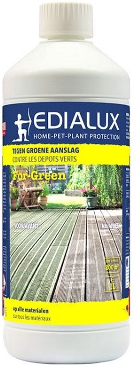 Wil je een geconcentreerd product dat groene aanslag verwijdert? Dan is Algenkiller van Edialux het product dat jij zoekt! Algenkiller verwijdert groene algen zonder problemen. Deze groene aanslag of algen maken paden en opritten gevaarlijk glad bij nat weer, dit kan je met For-Green vermijden. Groene aanslag houdt langer water vast op het oppervlak zoals bij muren en daken, hierdoor wordt dit oppervlak aangetast met mogelijk blijvende schade tot gevolg. Algenkiller NW verwijdert snel en langdurig groene aanslag op alle materialen en ondergronden zoals terrassen, paden, opritten, tuinmeubelen, vensters, afsluitingen, daken, grafzerken, muren, …. Je kan het zowel met de drukspuit als een gieter gebruiken. Na 1 à 3 dagen wordt de groene aanslag bruin, dit wil zeggen dat het afsterft. Het heeft ook een lange nawerking omdat het zich diep in de porieën van het oppervlak vastzet en maakt geen vlekken op de ondergrond. Je past het best toe in de maanden maart tot oktober.