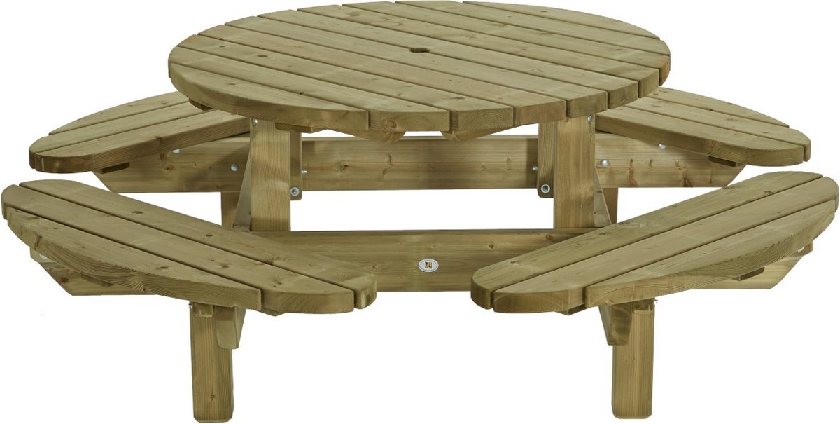 Talen picknicktafel rond 210 cmZeer kwalitatieve ronde picknicktafel van Talen. Waarbij Talen gebruik heeft gemaakt van een vrije instap, zo kan jong en oud eenvoudig aan de picknicktafel zitten. De picknicktafel maakt gebruik van een stevige kruisconstructie, voor extra degelijkheid. Het is mogelijk om met 8 personen plaats te nemen aan de picknicktafel. Naast de stevige kruisconstructie heeft de picknicktafel ook een parasolopening voor extra comfort. Het hout dat wordt gebruikt is FSC-gekeurd Noord-Europees vurenhout, geheel splintervrij en onderdeel per onderdeel duurzaam geïmpregneerd. Voor de afwerking wordt alles vanaf de onderzijde geschroefd. Formaat: 210x210x76 cm Zithoogte: 46 cm Dikte van de planken: 45 mm Geschikt voor 8 volwassenen Vurenhout met FSC-keurmerk