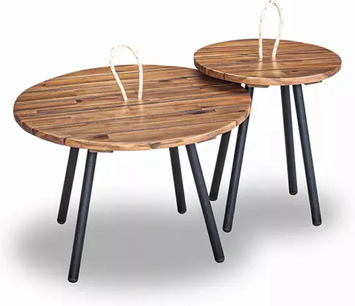 Deze leuke set met ronde salontafels is goed te combineren met verschillende tuinmeubels. De set bestaat uit 2 koffietafels gemaakt van aluminium en acacia hout. De tafels zijn voorzien van een lus bovenop als leuk detail en om de tafels gemakkelijk op te kunnen pakken. De grote tafel heeft een afmeting van Ø60x45 cm en de kleine tafel Ø40x40,5 cm.ProductvoordelenLicht in gewichtGemakkelijk op te pakken