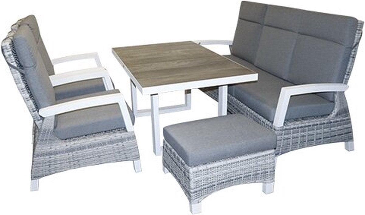 Met de Trestino Rovereto Sofa Lounge diningset - 5p kom je helemaal tot rust! De sofa lounge diningset wordt geleverd met comfortabele kussens én heeft verstelbare rugleuningen.Deze luxe tuinset bestaande uit een ruime 3-zitsbank, 2 royale fauteuils, 1 voetenbank en een dining tuintafel.De tuinmeubelen hebben een stevig aluminium frame en zijn omwikkeld met kunststof wicker. De tuintafel heeft een onderstel van aluminium en he... lees meer over dit product
