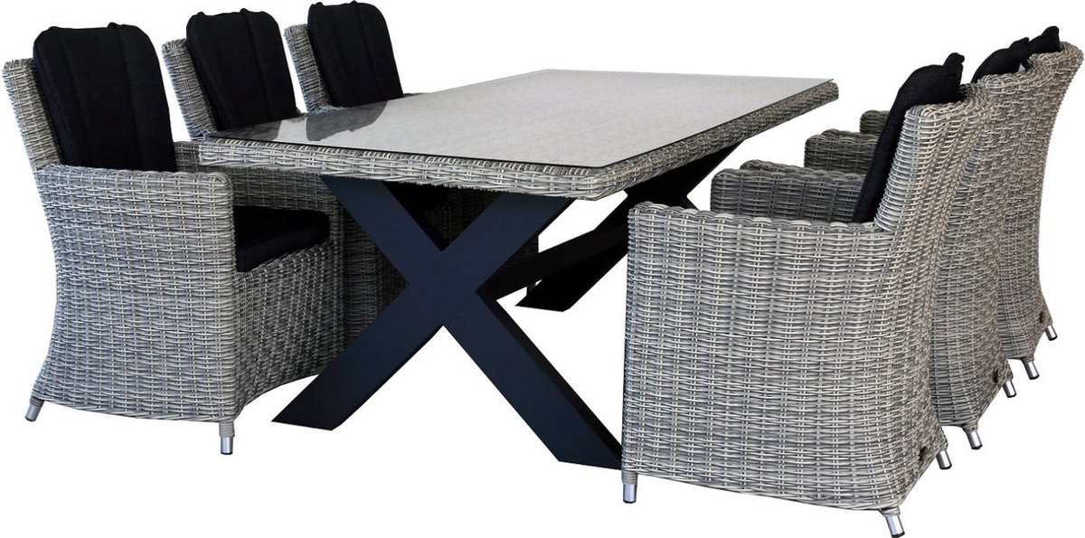 Diningset San Vito Lazio Grey. Ontdek het ultieme comfort en stijl met de hoogwaardige tuinmeubelen van Oosterik Home, perfect voor elke buitenruimte. Laat uw tuin stralen met onze duurzame en elegante ontwerpen, ideaal voor ontspanning en entertainment in de frisse buitenlucht.