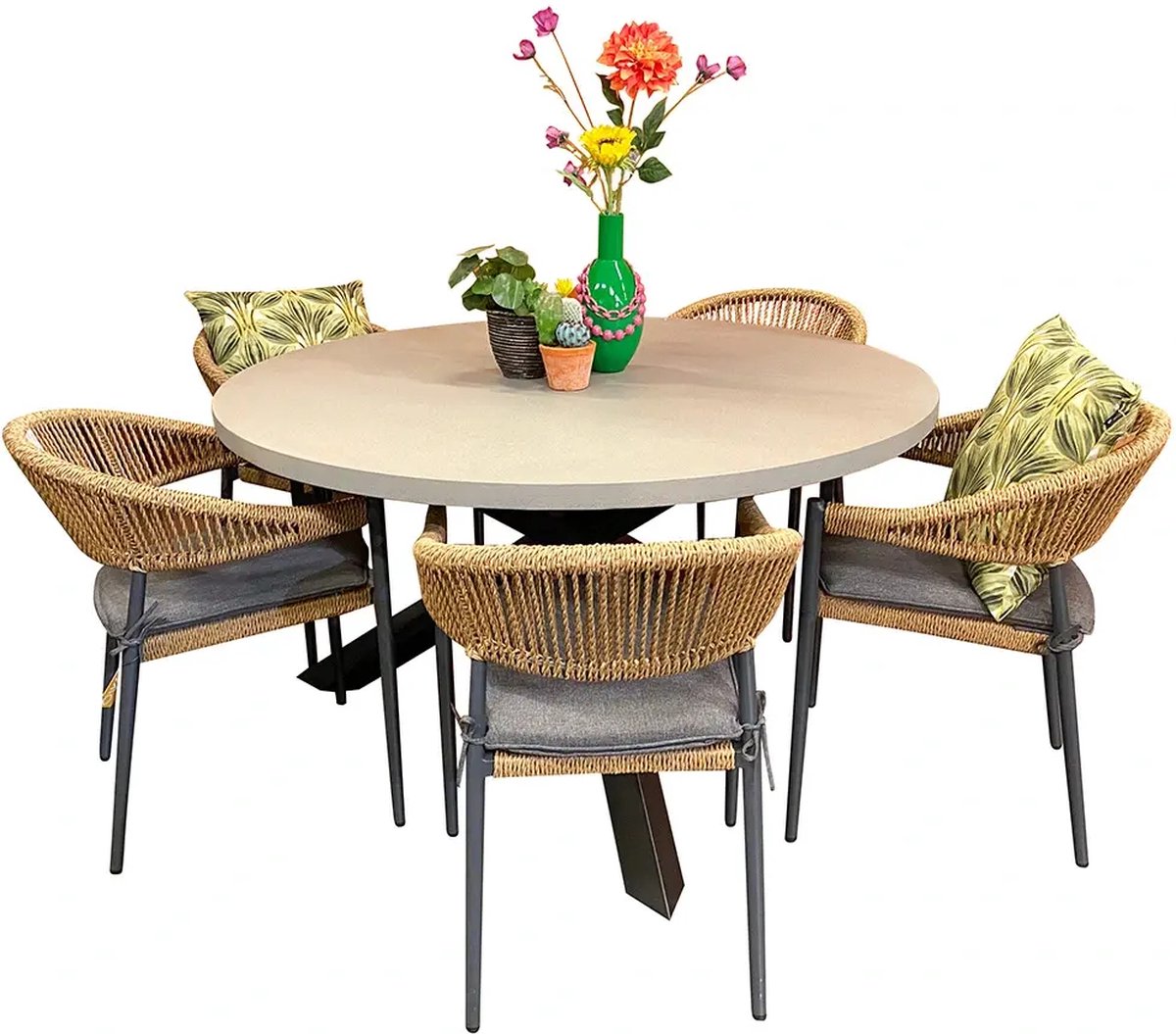 De mooie Buitengewoon Boet Antwerpen Casinoset - 5p. is geschikt voor 5 personen. De tuinset bestaat uit een ronde tuintafel en 5 tuinstoelen.De 5 Casino tuinstoelen zijn gemaakt van een stevig aluminium frame met daaromheen rope. De stoelen worden geleverd inclusief zitkussen.De Antwerpen tuintafel heeft een frame van staal en een tafelblad van polystone. Polystone is sterk, duurzaam en onderhoudsvriendelijk.Bij gebruik van een hoes over de tafel (niet inbegrepen): Zorg ervoor dat er geen plasvorming kan ontstaan op de hoes. Plaats een vorstbestendige bloempot omgekeerd in het middel van het tafelblad, onder de hoes, zodat regenwater van de hoes af glijdt en er altijd ventilatie is onder de hoes. Anders kan het overmatige vocht de tafel beschadigen.ProductvoordelenDuurzaamOnderhoudsvriendelijkAfmetingen (cm)Stoel: L55 x B56 x H75Zitting: D44 x H48Tafel: Ø135 x H76