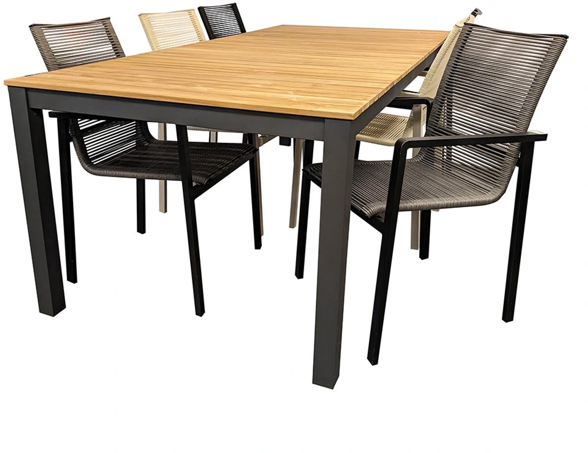 Ontworpen voor comfort en uitstraling: de Arashi Diningset Yoi in bruin en antraciet kleurstelling met een basis van teak en rope en aluminium. Brengt sfeer en luxe naar buitenruimtes met oog voor detail.