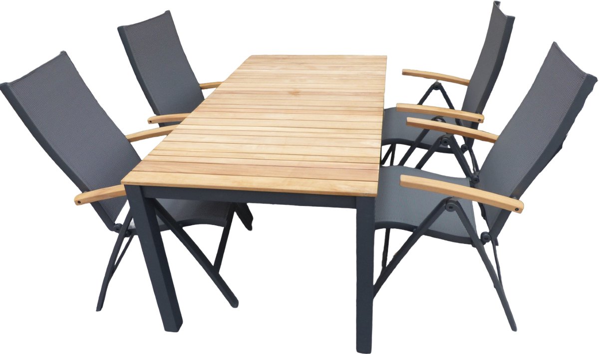 Set van Arashi tafel 169x90 cm grijs/teak en 4 Lucca stoelen antraciet/teak. Complete Arashi tuinset met grijze teak tafel en vier Lucca stoelen voor sfeervol dineren.