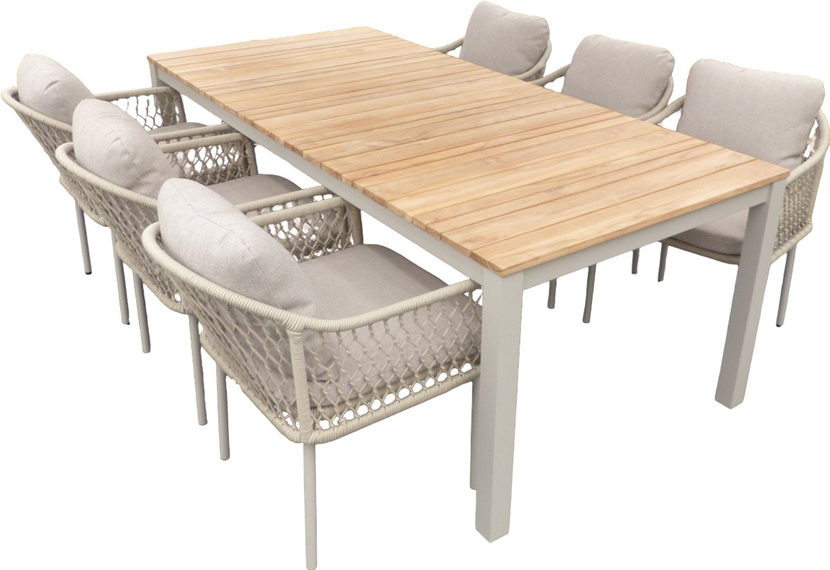 Set van Arashi tafel 220x100x76 cm salix/teak en 6 Rocha stoelen salix/flax beige. Natuurlijke Arashi salix/teak tafelset met 6 flax beige Rocha stoelen voor een warme tuinsfeer.