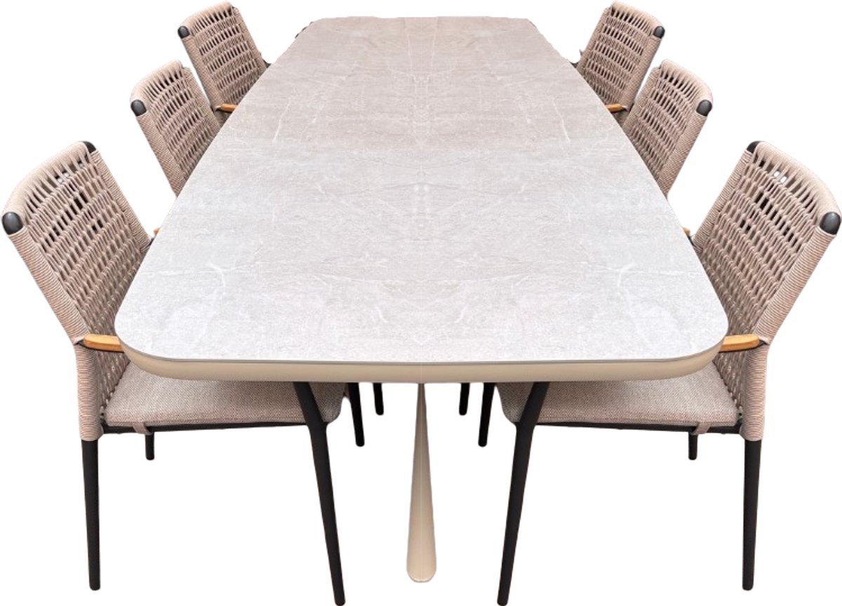 Boat dining set 2. Deze moderne set met antracietkleurige stoelen bevat een tafel van 240 x 110 x 74 cm met sintered stone blad en aluminium frame. Dit komt uit het assortiment Tuinsets, koop hem gemakkelijk en goedkoop online! Dit product verkopen wij per stuk tenzij anders aangegeven. lees meer over dit product