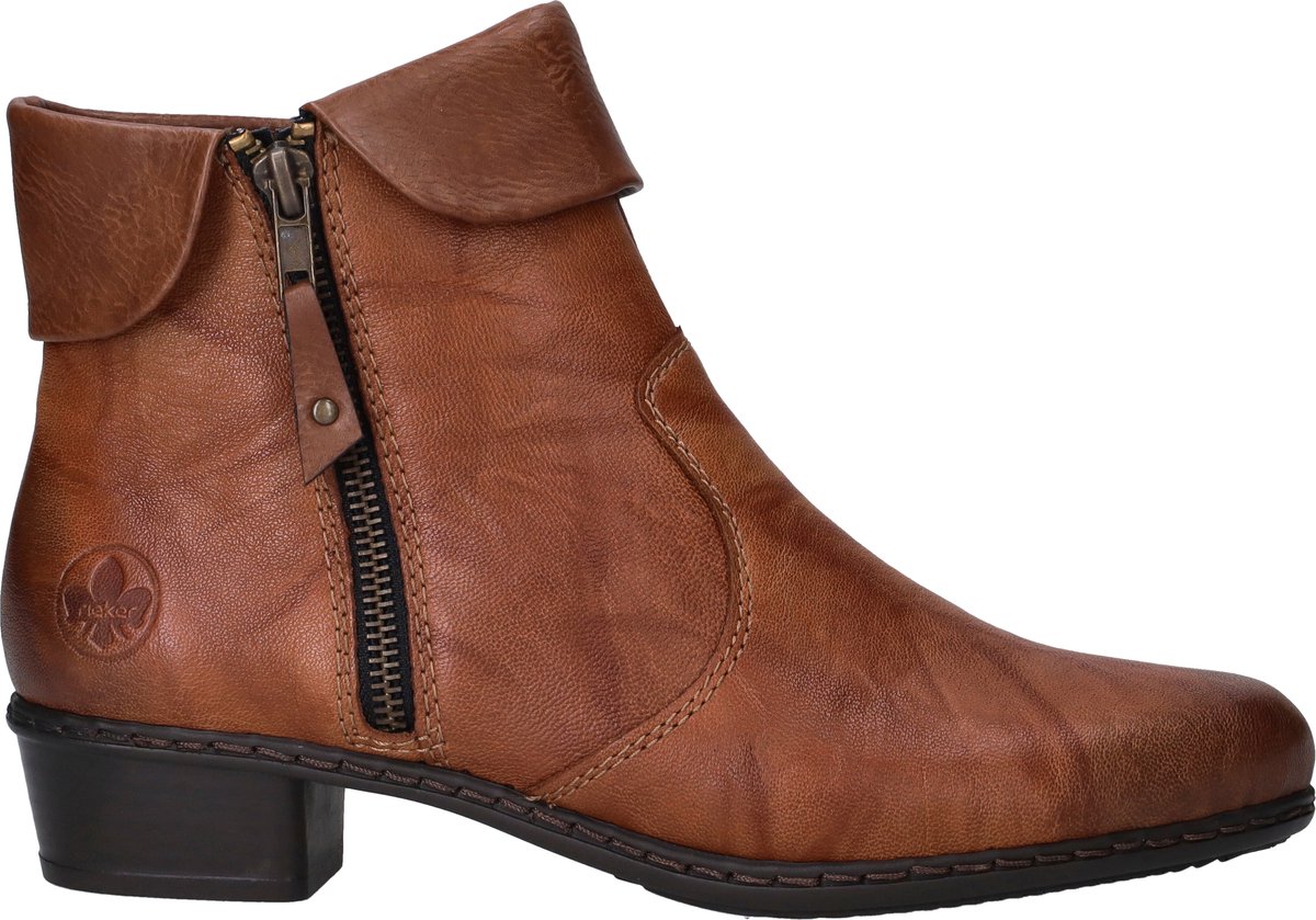 De modieuze Rieker enkellaarsjes voor dames zijn een aanwinst voor de garderobe. Dit model kan je makkelijk combineren met al je favoriete looks en biedt enorm veel comfort. De schoenen zijn uitgevoerd in cognackleurig leer en hebben een zacht, warme voering van textiel. De schoenen hebben een crash-look. Dit is een opzettelijke verkreukeling van het materiaal, waardoor er een leuk effect ontstaat. Dankzij de Antistress binnenzool geniet je van een licht gevoel, flexibiliteit en schokabsorptie. De ritsen aan beide zijkanten zorgen voor een makkelijke instap. De schoenen hebben een lage hak met een hoogte van 3 centimeter. Een ideale hoogte wanneer je veel moet lopen, maar wel graag een schoen draagt met een elegant hakje. De Rieker enkellaarsjes hebben een iets smallere pasvorm en een vast voetbed.
