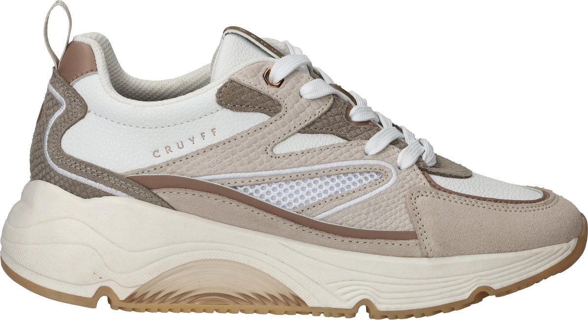 Deze beige sneaker van Cruyff is dé perfecte mix van stijl en comfort. De Cruyff Madina combineert leer, kunstleer en ademende mesh in een frisse, lichte kleurstelling. De opvallende chunky zool geeft een sportieve uitstraling en loopt heerlijk zacht dankzij de extra demping.