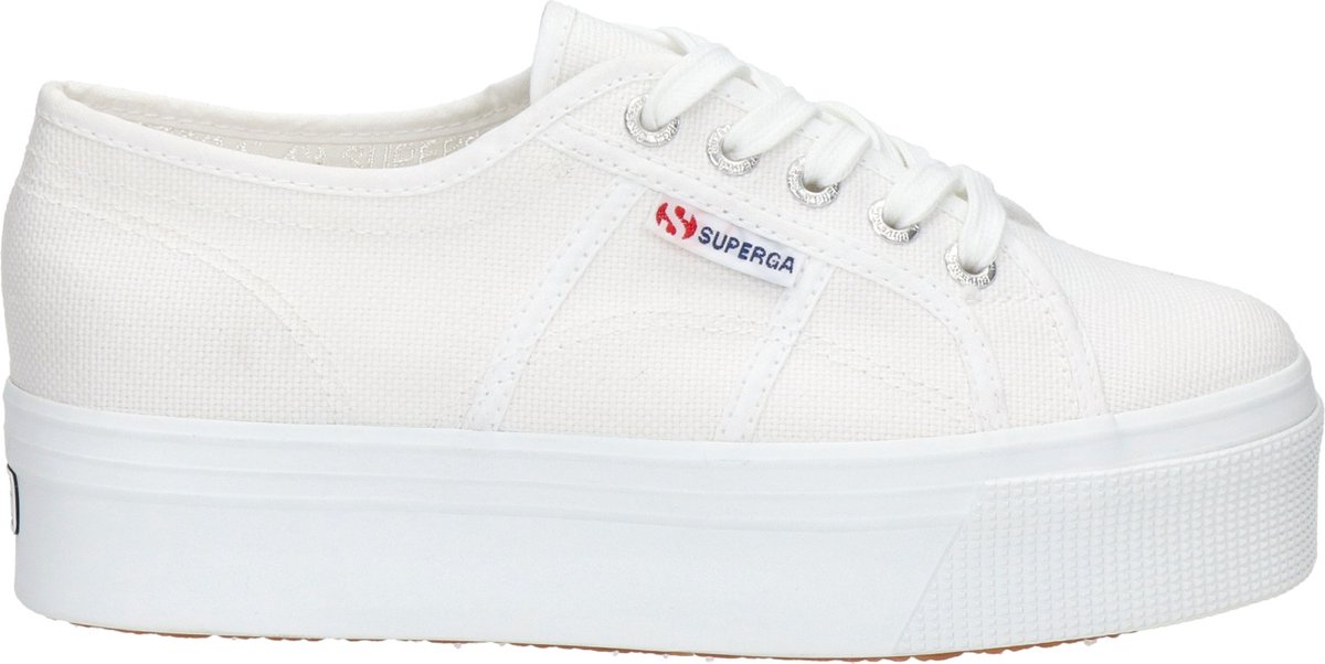 Uit de collectie van het Italiaanse merk Superga is deze trendy lage sneaker 2790 Cotw Line UP AND Down met vetersluiting. Dit model is geheel uitgevoerd in wit canvas en heeft een vaste binnenzool. Dit casual exemplaar is afgewerkt met biezen en zilverkleurige veterringetjes. De sneaker heeft een opvallende witte platformzool van zo'n 4,5 cm dik met op de neus een fijn reliëf en bij de hiel een merkopdruk. De stevige schoenzool is uitgevoerd in rubber en heeft een fijn profiel.