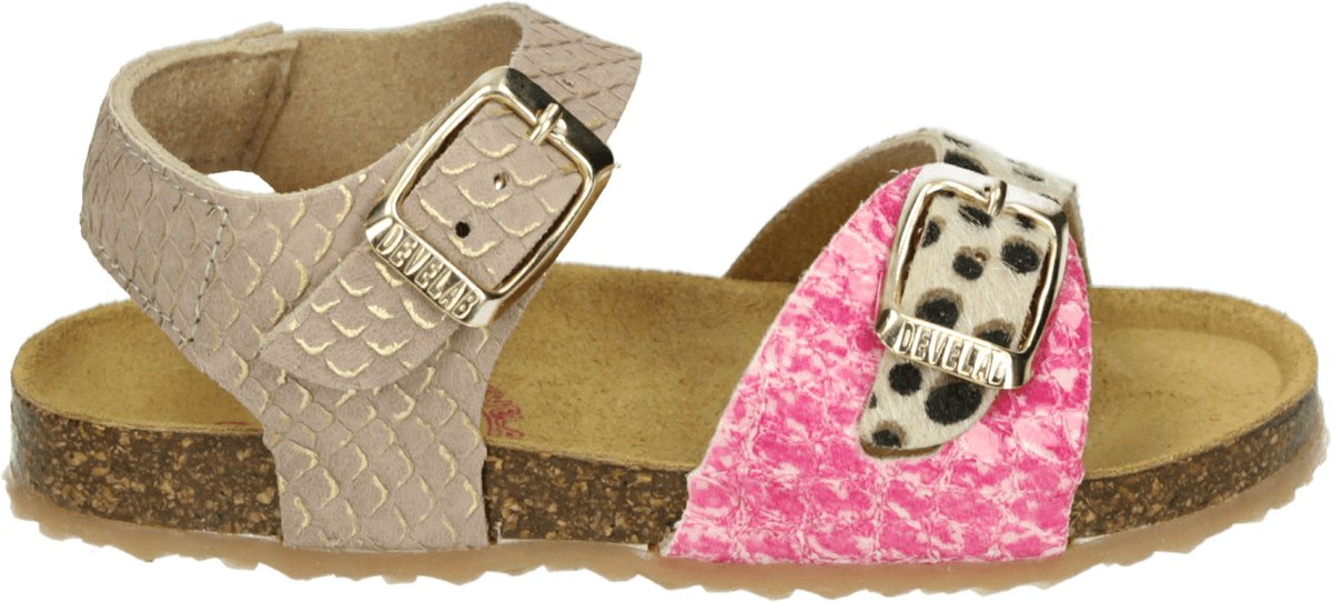 Met deze veelzijdige sandaaltjes 48314 van het merk DEVELAB ben jij helemaal klaar voor die heerlijke zonnige dagen! De buitenkant van dit sandaaltje is gemaakt van zacht, gestructureerd suèdelook en roze leatherlook met een paneel van panterprint ponyhairlook om deze sandaal en vrolijke boost te geven. Beide bandjes zijn voorzien van gouden gespjes met merkreliëf, zodat je 'm perfect aanpast naar de voet. Het binnenwerk heeft een suède voering en een fijn licht voorgevormd voetbed met een suède toplaag. De kurken tussenzool zorgt voor een goede demping en de rubberen loopzool voor een goede grip. Hiermee ben jij verzekerd van urenlang comfortabel dansen, springen, rennen, huppelen, klimmen en klauteren!
