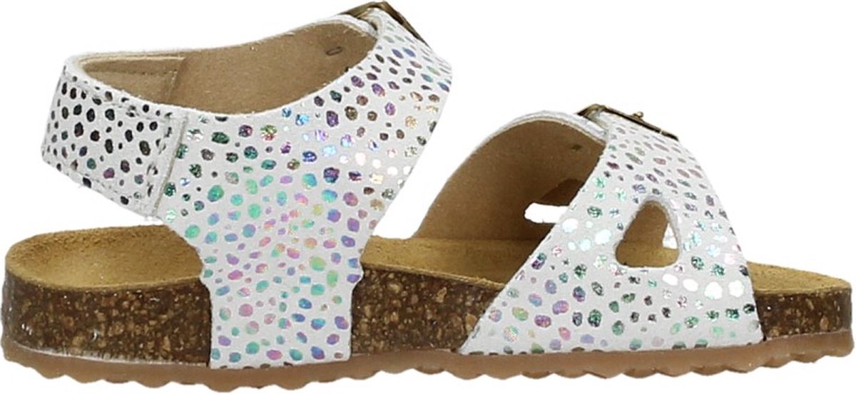 Met deze witte sandaaltjes 48308 van het merk DEVELAB ben jij helemaal klaar voor die heerlijke zonnige dagen! De buitenkant van dit sandaaltje is gemaakt van zacht suède met een glanzende folie in verschillende regenboogkleuren om deze sandaal een vrolijke boost te geven. Beide bandjes zijn voorzien van gouden gespjes, zodat je 'm perfect aanpast naar de voet. Het binnenwerk heeft een suède voering en een fijn licht voorgevormd voetbed met een suède toplaag. De kurken tussenzool zorgt voor een goede demping en de rubberen loopzool voor een goede grip. Hiermee ben jij verzekerd van urenlang comfortabel dansen, springen, rennen, huppelen, klimmen en klauteren!