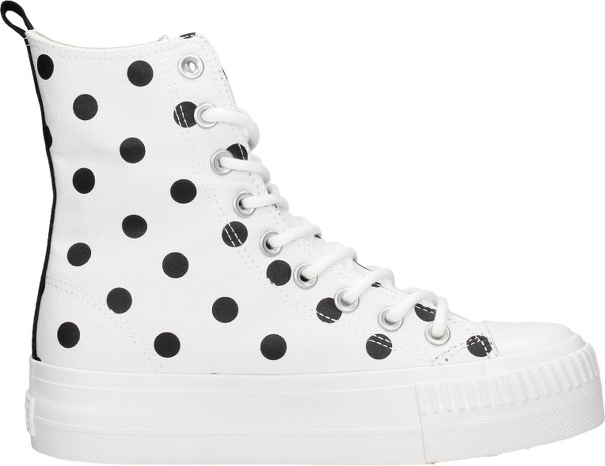 Zoek je nog een toffe hoge sneaker met printje? Kies dan voor deze leuke British Knights veterboot. Deze veterboot is wit en heeft zwarte bolletjes. Daarnaast heeft de schoen een platformzool .