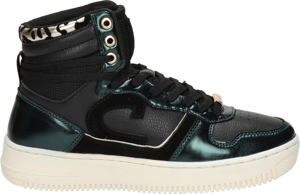 Dit pareltje van het merk Cruyff is geïnspireerd op de hoge sneaker trend met geüpdatet, elegante lijnen en panelen. Deze zwarte sneaker Campo High LUX is uitgevoerd in leatherlook met panelen van groen metallic. Op de zijkant van de sneaker zit een zwarte suède ‘C’ logo, een handig aantreklusje met merkreliëf en op de tong zit een merklabel. De tong en zijkanten zijn van zwart mesh. Ook de gouden details zoals het merkplaatje op de veters, de veteroogjes en het biesje aan de gevoerde enkelkraag met suèdelook maakt dit model extra fabulous. Verder heeft deze gave sneaker een heerlijk zacht binnenwerk van gevoerd textiel met een uitneembare EVA midsole die zorgt voor extra ondersteuning en comfort. De witte rubberen zool heeft speels reliëf rondom de neus en hiel en de zijkanten van de zool zijn gesierd met opvallende diepe groeven. De loopzool heeft een fijne structuur die zorgt voor een goede grip tijdens al je wandelingen. Combineer hem met een casual outfit of ga voor een zomers jurkje, met wat draag jij 'm?