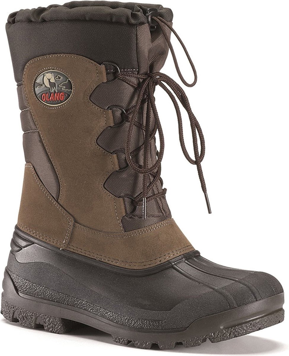 De Olang Canadian is een snowboot met een hoge schacht. De laars is vervaardigd van suède leer. De zool biedt grip en maakt de voet van de laars waterdicht. De laars is gevoerd met een polyester wollen voering. De Canadian heeft een vetersluiting en een tie-on koord aan de bovenzijde, zodat de laars goed om de kuit sluit.