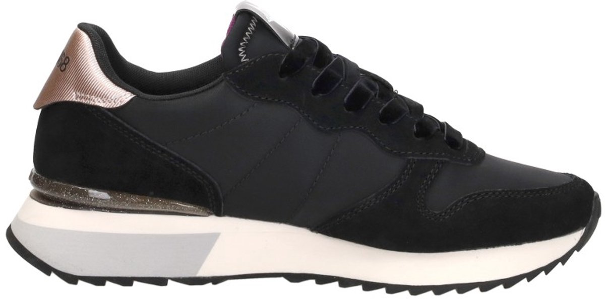 Kleur: Zwart. Samenstelling: 49% leer, 41% textiel, 10% polyurethaan. Sluiting: Fluweelzachte veters. Binnenkant: Micro mesh voering. Zool: Gefreesd EVA met rubberen profiel. Details: Stargirl Glitter sneaker voor dames met een bovenkant van nylon en suède, verrijkt met een glitterpatch met geborduurd logo en een spoiler met slangenprint aan de achterkant. Een sterrenlabel op de tong en gelamineerde details maken het vrouwelijke en glanzende design compleet. Gebruik: Perfect om een vleugje glamour toe te voegen aan alledaagse outfits, ideaal voor in de stad met jeans, rokken of casual jurken.