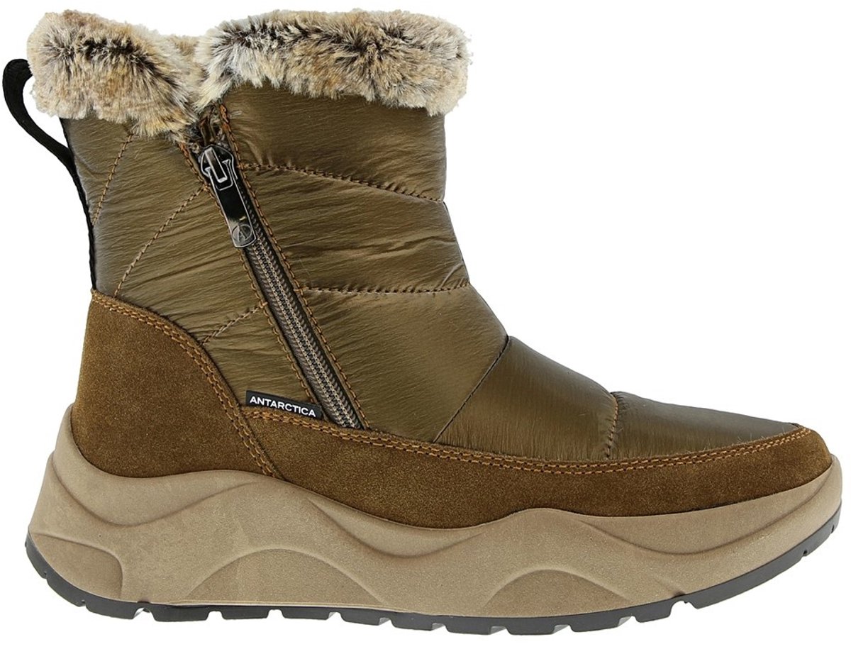 Antarctica AN 8753 bruin snowboots dames De Antarctica 8753 is een snowboot voor dames met een decoratieve fake fur boord. De snowboot heeft een suede upper met polyester en een hoge rubberen zool, de voering is van synthetisch wol. De snowboot heeft een ritssluiting en aantreklus voor makkelijke in- en uitstap. Kleur: bruinMateriaal bovenwerk: nylon, suéde
